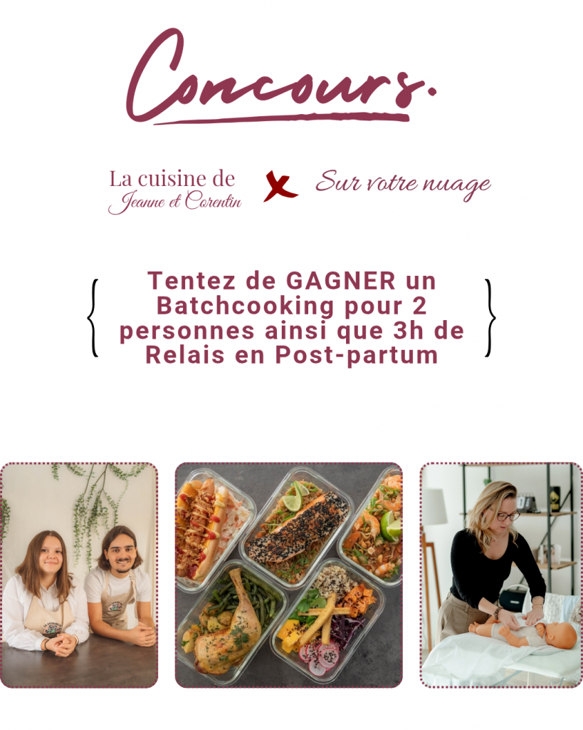 Pour célébrer cette nouvelle collaboration avec la cuisine de Jeanne et Corentin, nous souhaitons tirer au sort une future famille qui remportera un Batchcooking de 3h (3 repas pour 2 personnes) ainsi qu’un relais Post-partum.